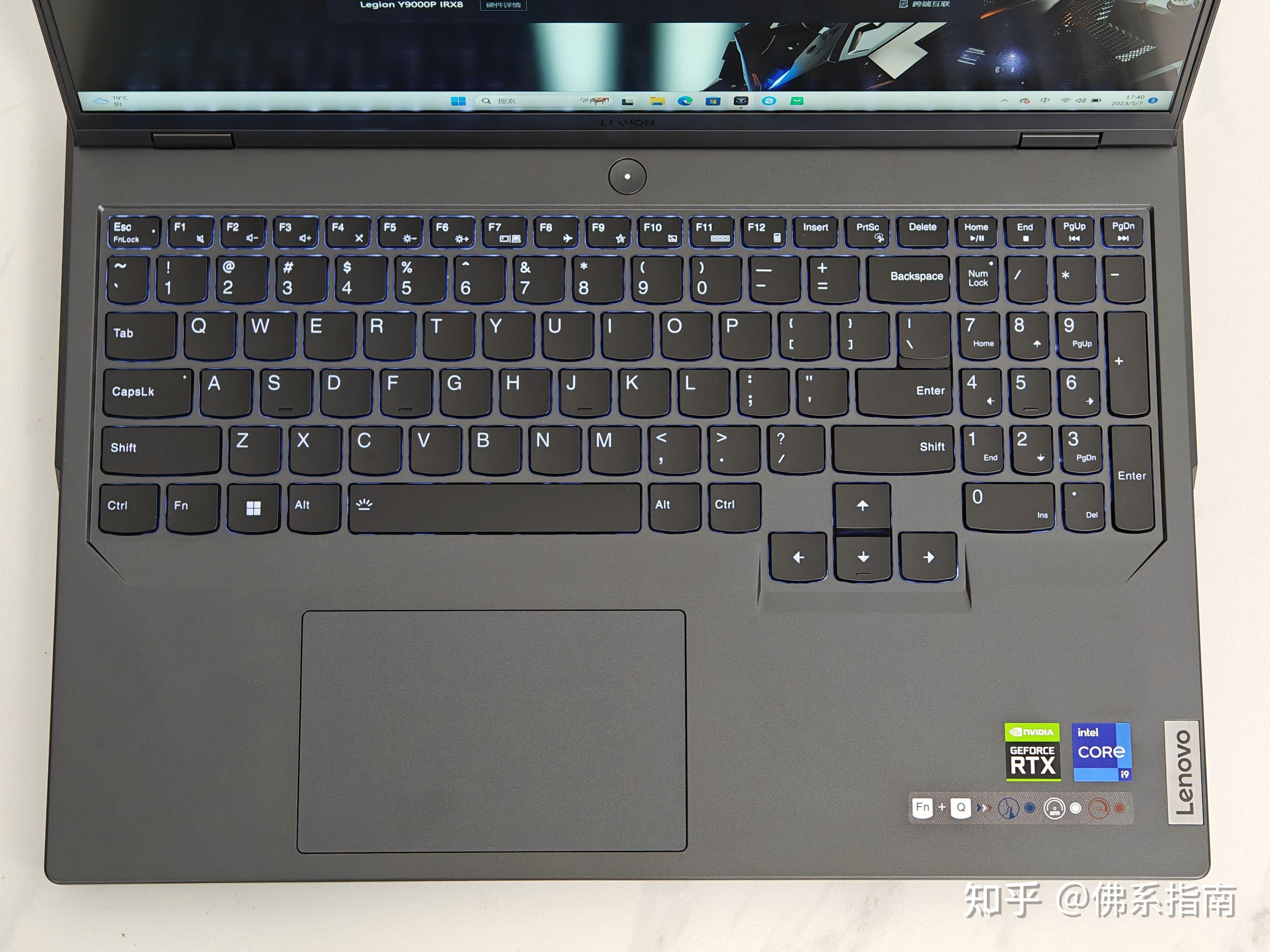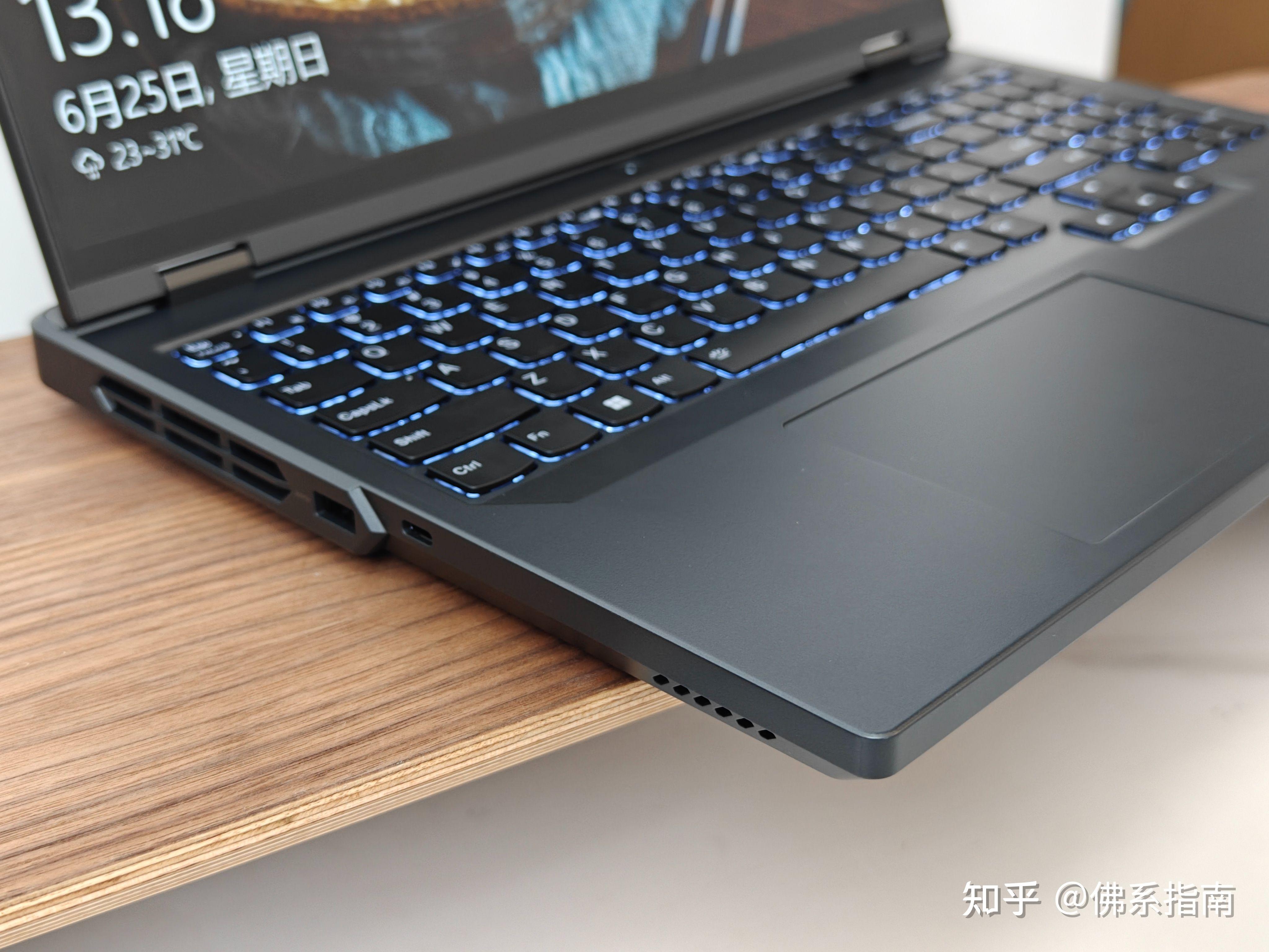 B面键盘方面,拯救者的键盘一直在游戏本里面算是好评项,全尺寸方向键和数字小键盘都有。并且电源按键还有性能模式标识:白色的代表均衡模式,蓝色代表按键模式,红色代表性能模式。