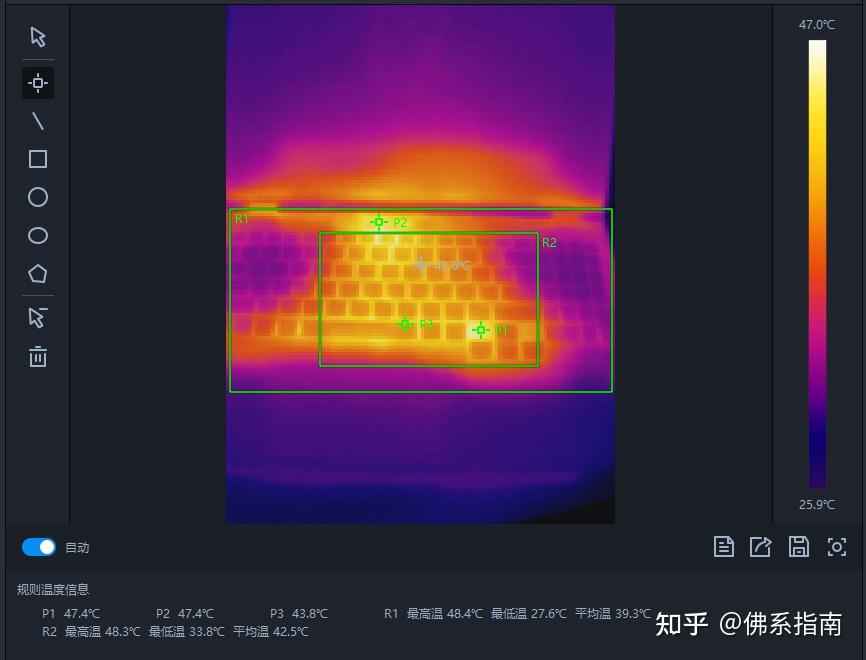 温控方面,整机温度控制还是不错的,键盘平均温度39.3℃,最高温度48.4℃,这个温度还是可以的。不过键盘温度主要集中在键盘中央以及方向键位置,并且最高温度有48℃,主要在方向键附近,这样的温度分布,对于经常使用自带键盘打游戏的人来说,还是有点偏热的,不建议一直用自带键盘打游戏。