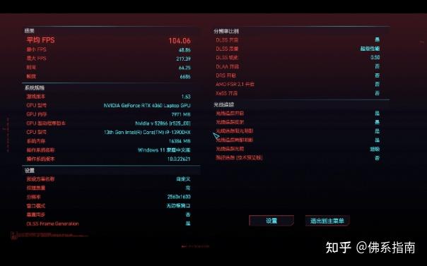 然后是《赛博朋克2077》,分辨率为2560*1600,画质为高(预设最高的画质选项),DLSS开启超级性能、开启光线追踪:超级。可以做到平均帧率104帧,非常高的帧率表现了。