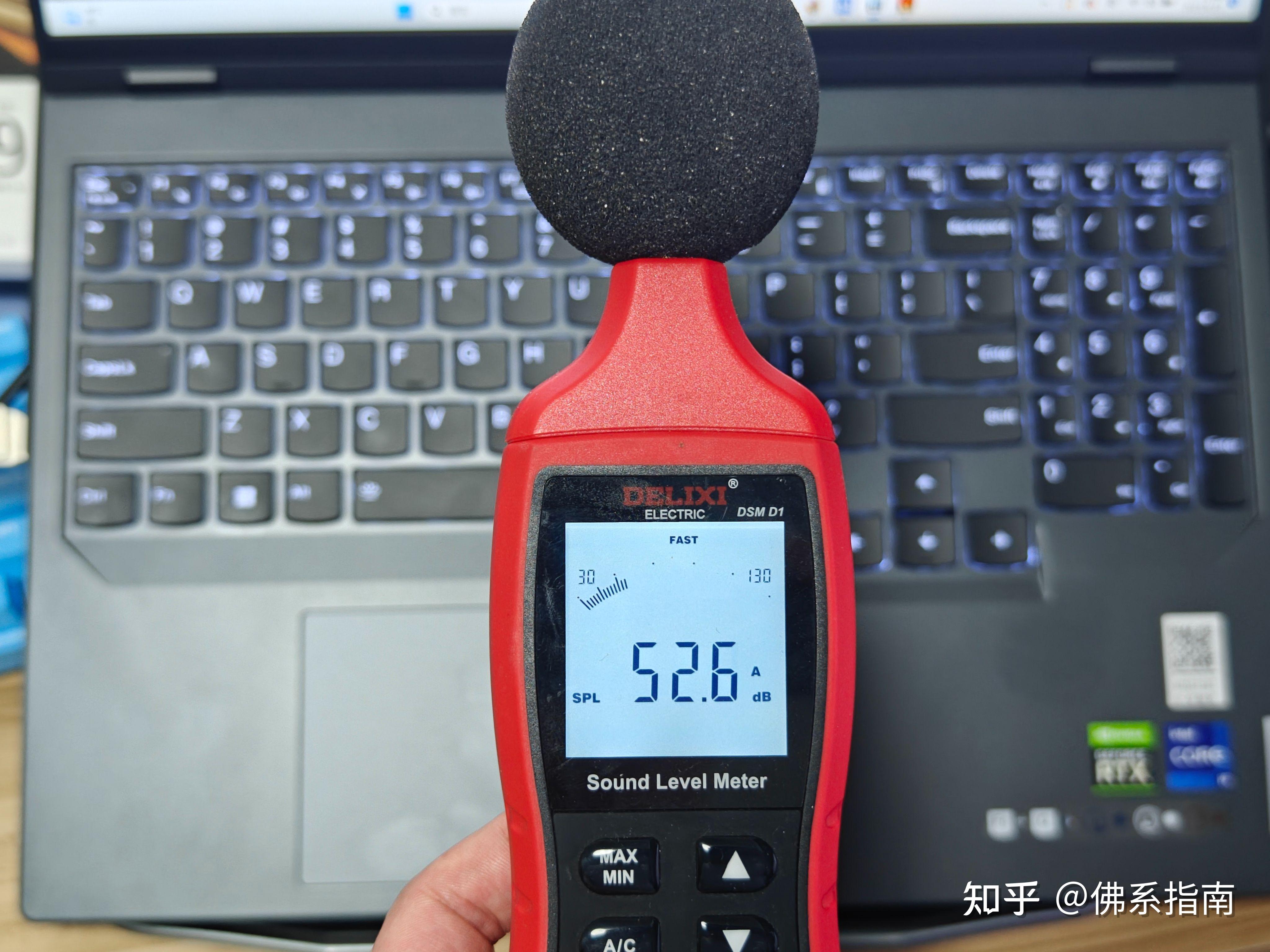 噪音方面,在临近键盘边缘的位置,开启超能模式,此时噪音为52.6dB,此时双风扇转速拉满,整体声音大了很多,不建议超能模式下打游戏,真的很吵。