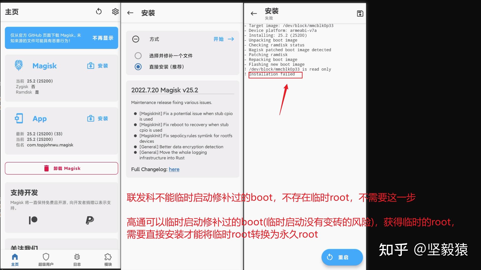 (高通的cpu才需要)进入 Magisk Manager,选择安装-直接安装,才能将临时 root 转换为永久 root。