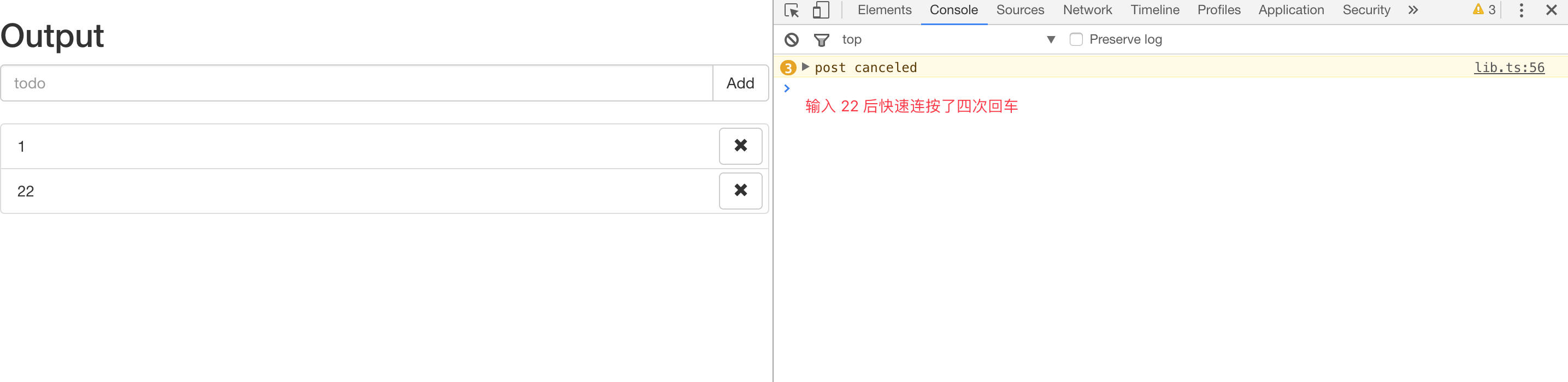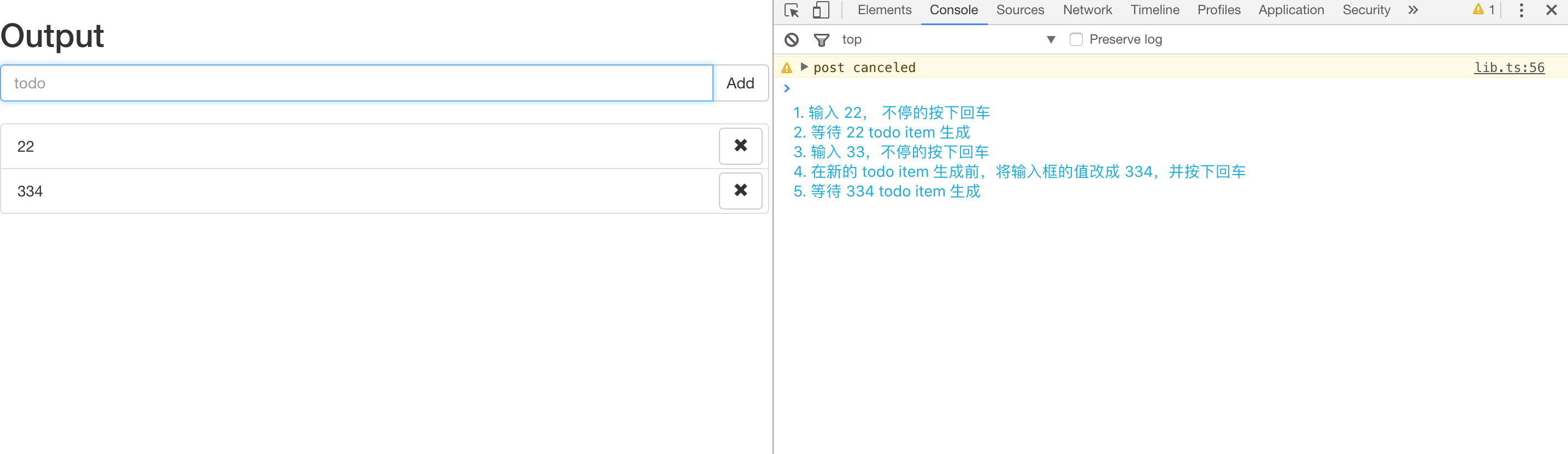 - 输入值,并在 todo item 生成前多次回车,可以看到请求被 cancel 了多次: