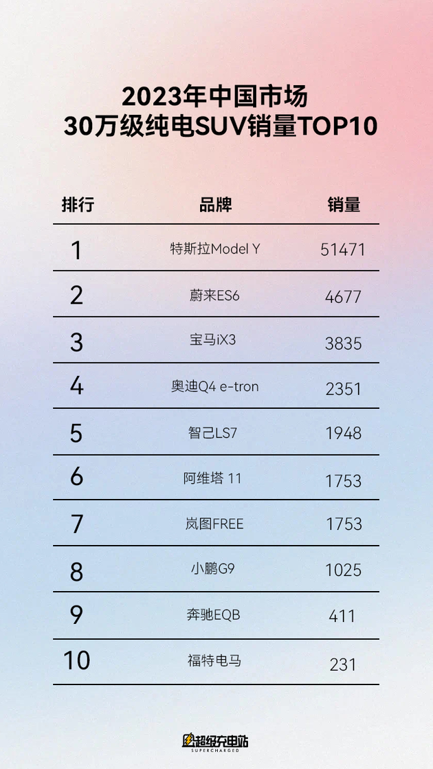 2023 年第二季度结束,一张中国市场 30 万级纯电 SUV 销量 TOP10 榜单开始在网上流传,奥迪 Q4 e-tron 以 2351 的月销量排名第 4。