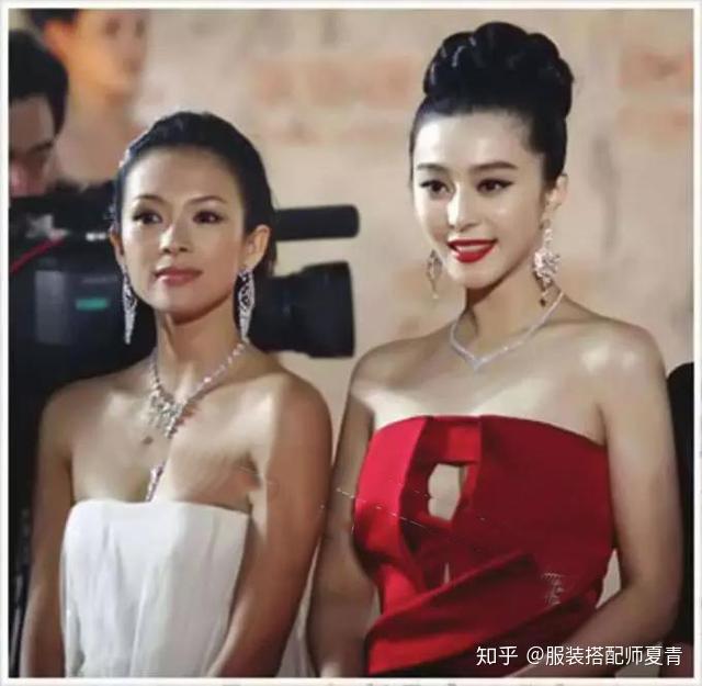 如下图,章子怡在范冰冰的陪衬下,显然黯然失色,这是因为范冰冰的妆容用上了浓眉、大红唇、大耳饰的缘故,气场、五官的立体感都比章子怡的强。