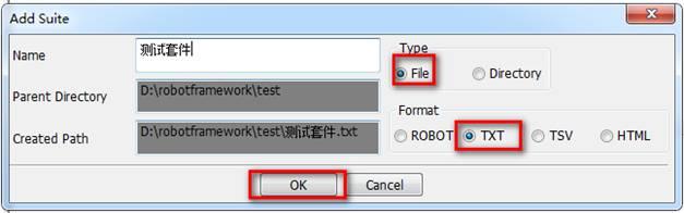 注 :选择file原因是,在file的测试套件下可以创建测试用例,如果是tpye为directory,还得重新再继续建file的测试套件,才能创建测试用例,因为测试用例只能在file类型下创建。