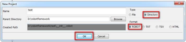 注 :选择directory原因是,在directory的项目下可以创建测试套件,如果是tpye为file,则只能创建测试用例,这不利于用例的管理。