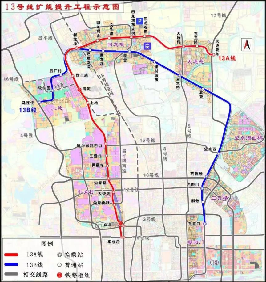 据了解,北京地铁13号线扩能提升工程,是在既有13号线西二旗—龙泽—回龙观区间,将既有倒“U”型线进行拆分,在16号线和17号线之间搭建新的“X”型东、西横向线,形成13A和13B两条线路。“13号线扩能提升工程作为国内最大规模的既有线改造工程,把13号线拆分成两条线,一条线是从西直门往北到新龙泽之后,往东到天通苑东站,这是A线;B线是从东直门往西到新龙泽之后,往海淀软件园到马连洼站跟16号线实现换乘。”京投所属轨道公司第二项目管理中心副总经理高亚彬表示,项目建成后将加密回龙观、天通苑等大型居住区的内部轨道线网,缓解回天地区车站限流压力,化解西二旗站的客流堆积、西直门站的换乘压力。