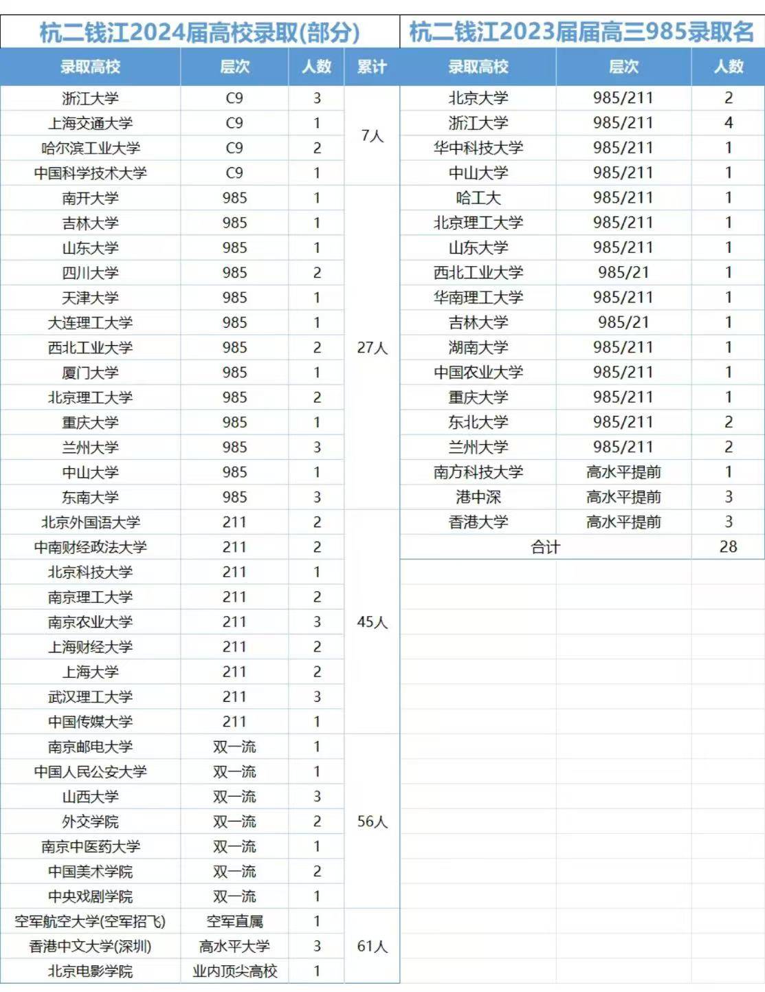 同时,对比23年杭二钱江校区的高考成绩来看,去年的杭二钱江校区有27位同学被985院校所录取!而23年的成绩仅仅只有21位,这其实是一个很大的提升,涨幅接近30%。虽然样本基数比较小,但是确实在去年的高考中,杭二钱江校区的表现是十分出色的!并且今年除了有27位的同学被985院校录取之外,还有18名同学被全国多所知名的211高校录取,诸如北京外国语大学、中南财经政法大学、北京科技大学等排名比较靠前的211。再加上只是部分数据的统计,其实真实的被211高校录取的人数还会更多。