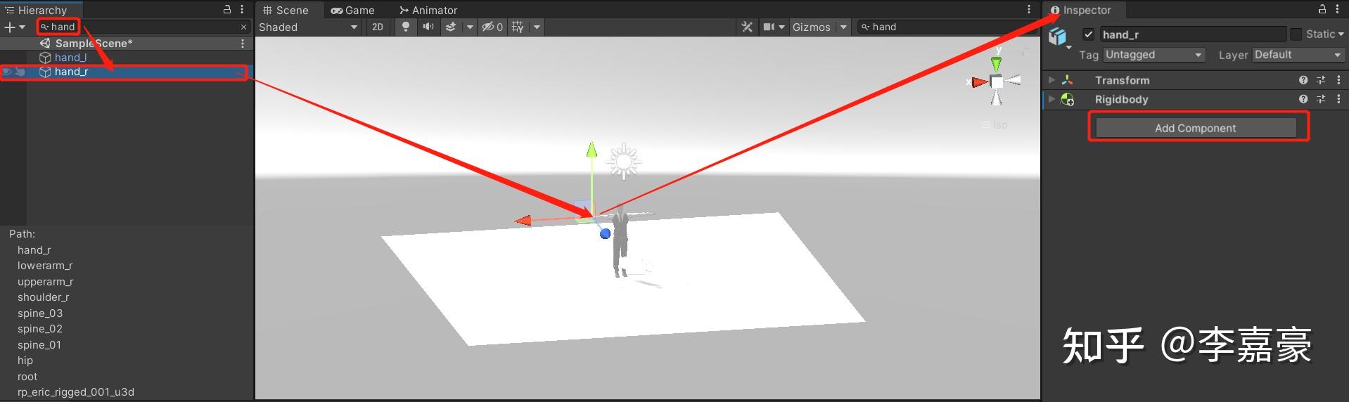 选择右手hand_r,可以看到场景中领带男的右手出现XYZ坐标系,inspecter导航页出现其位置信息,选择Add Componet,依次添加rigidbody以及mesh collider组件,对右手添加刚体和碰撞器,同时我们设定左手为刚体,即可完成局部挂载。
