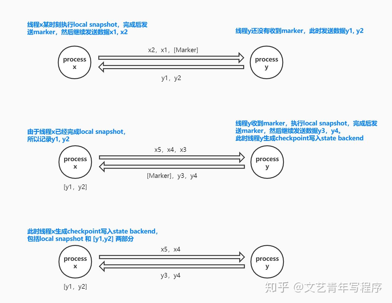 Chandy-Lamport 算法针对的是有向有环图,而 Flink 任务是 DAG(有向无环图),所以 Flink 在 Chandy-Lamport 算法的基础上做了一些改动,marker 在 Flink 中被称为 barrier:
