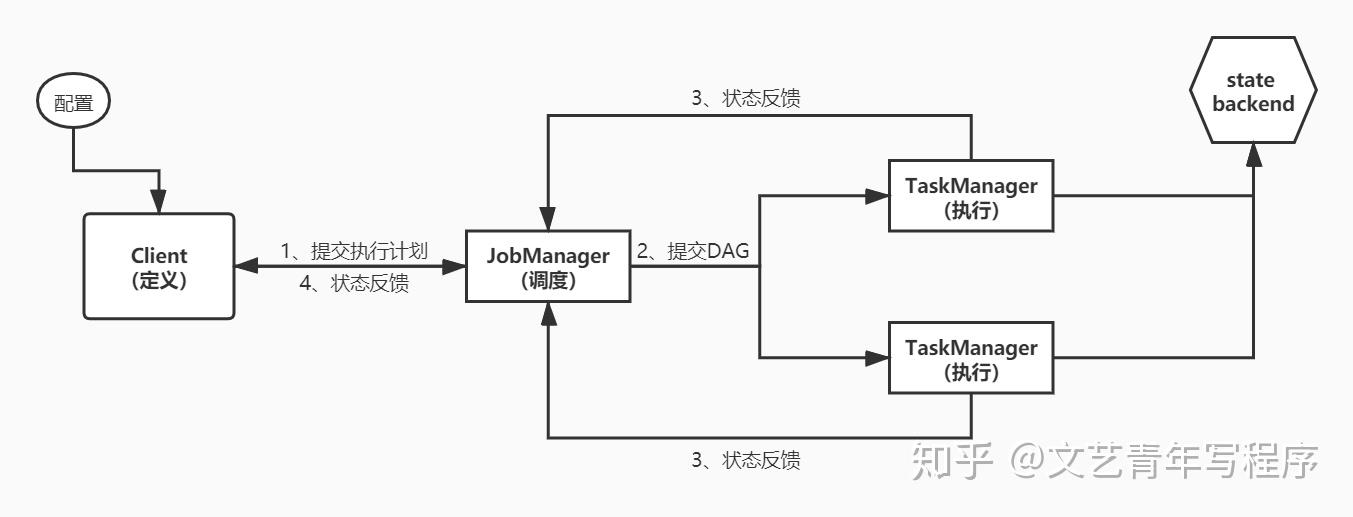 一个 Flink 程序从 Client 开始。用户首先提交 Flink 程序到 Client,Client 将其编译为执行计划,而后提交到 JobManager。JobManager 继续解析收到的执行计划,根据算子的并发度划分 SubTask,形成一个可以被实际调度的有向无环图(DAG),然后申请调度集群资源,发送 DAG 到 TaskManager 执行。