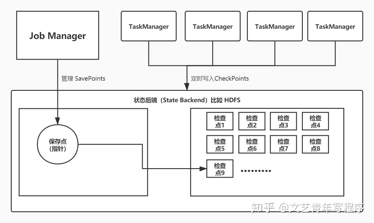- SavePoint 的侧重点是“维护”。Flink作业需要在人工干预下手动重启、升级、迁移或 A/B 测试时,先将状态整体写入可靠存储,维护完毕之后再从 SavePoint 恢复现场;