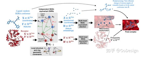 图1展示了EquiBind的模型架构。简单来说,该方法利用E(3)协变网络生成配体和受体上的结合关键点,而后在三维空间中对这些点进行匹配来确定结合模式。同时,该网络还能够对配体的三维结构进行变换实现小分子柔性对接。