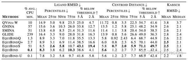 从结果上看,EquiBind在各项指标上均显著优于其他模型。该优势主要体现在Centroid Distance:即EquiBind能够正确找到小分子的结合口袋。同时,EquiBind的运行时间也显著优于其他方法。