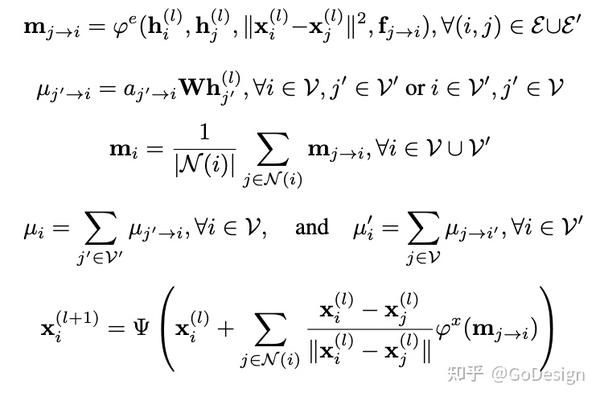 在给定输入后,EquiBind需要对输入信息进行分析,并输出蛋白-小分子的结合构象。该任务主要通过一个E(3)协变网络实现,称为IEGMN(Independent E(3)-Equivariant Graph Matching Network),该构架结合了E(3)协变图卷积网络以及图匹配网络,能够在特征提取的同时对3D坐标进行变换。在每一层,模型采取如下信号传递操作: