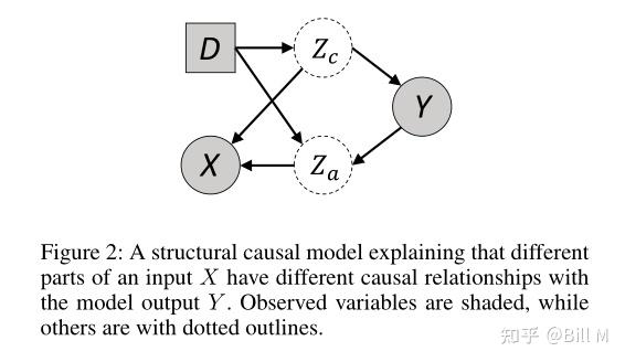 我们从一个结构因果模型开始,如图2所示。为了简单起见,我们省略了所有不必要的元素。一般来说,我们可以看到一个输入X可以分为两个变量,因果特征zc和环境特征za,在图2中,我们可以读出这两个特征都与Y相关,但只是zc被认为是一种因果特征。根据d-分离理念,我们认为所有数据的独立分布条件P(D,X,Y)应当满足: