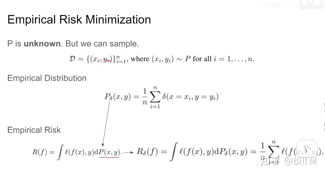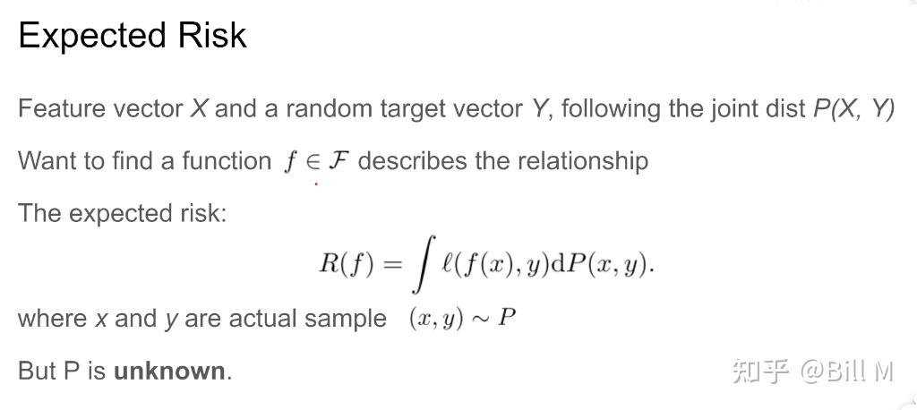 针对定义错的情况,我们定义expected risk,P(x,y)一个事件发生的概率,l-loss function,乘以这个事件发生的值,f是feature,x,y就是在P中采样的sample。