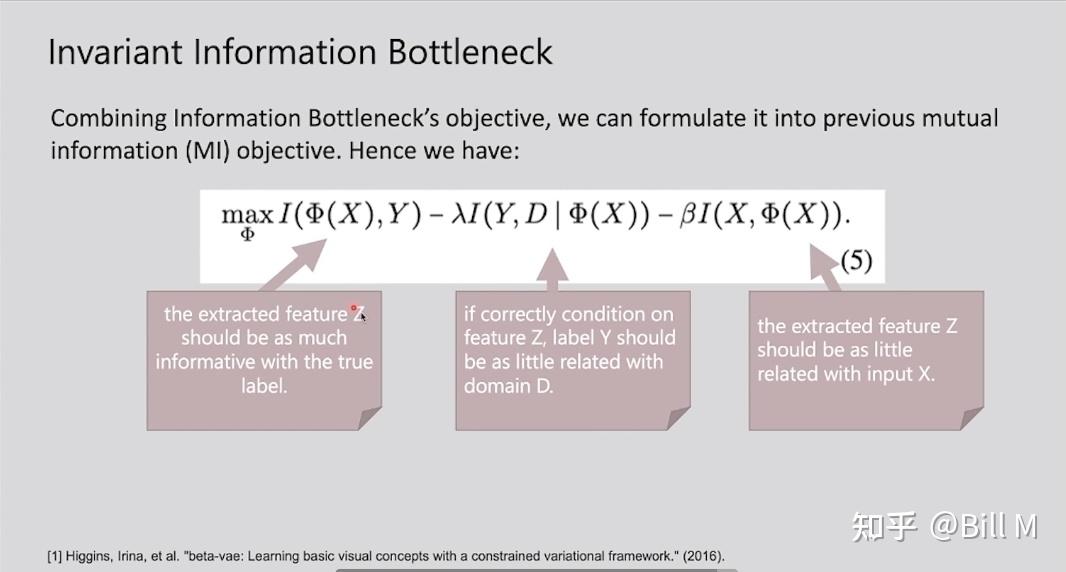 第一项是提取出的特征Z需要拥有真正label的所有信息。第二项是如果特征 Z 的条件正确,标签 Y 应该与domain D 的相关性尽可能小(这个意思就是你的Z尽量condition在一个正确的上面,比如说shape,outline,这样你是熊这件事情就和它来自于哪个domain无关了)。第三项是被提取的特征Z应该和输入X相关性比较小(还有多了就会出现pseudo-invariant现象)。