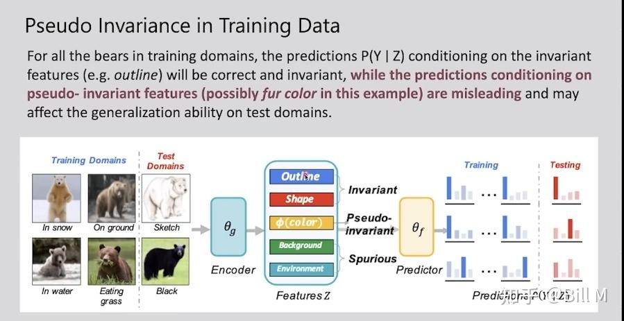 假设有6个domain,4个训练,2个测试,encoder后的outline和shape都是一致的,但是color是不一样的,训 练的时候偏棕色,但是测试的时候有的熊没有颜色了 。pseudo-invariant feature 伪不变特征。可以看出这个pseudo-invariant的来源是由于它用的feature太多了,那我们减少它用的feature会不会就好转了。