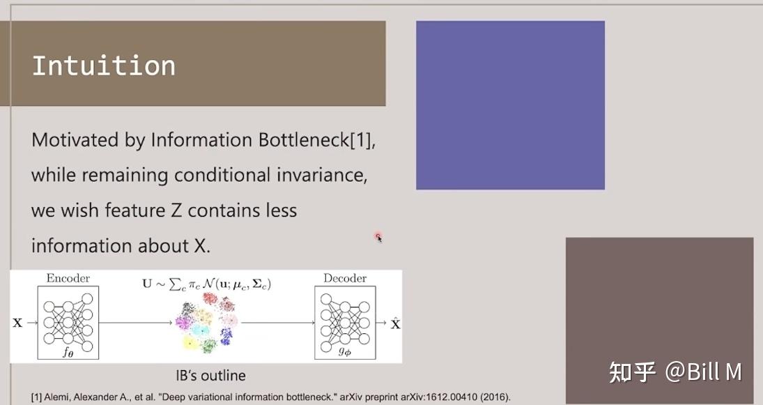 IB 简单一句话来讲就是它希望它的feature z被encoder后,服从一个多元高斯分布,服从多元高斯分布后它就能满足尽量的分离,尽量地无关,然后降维把最关键的信息保留下来。