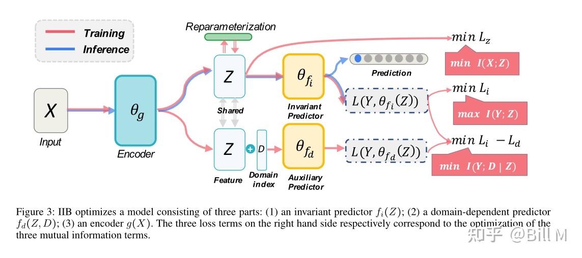 在上述目标函数的指导下,如图3所示,IIB优化了一个由三部分组成的模型:(1)不变预测器fi(Z) (Z);(2)域依赖的预测期fd(Z,D) (3)encoder g(X)