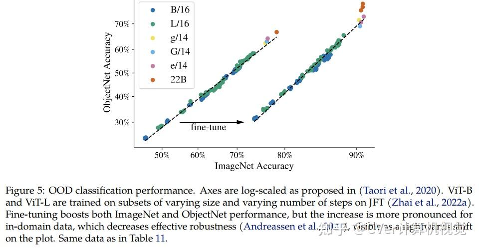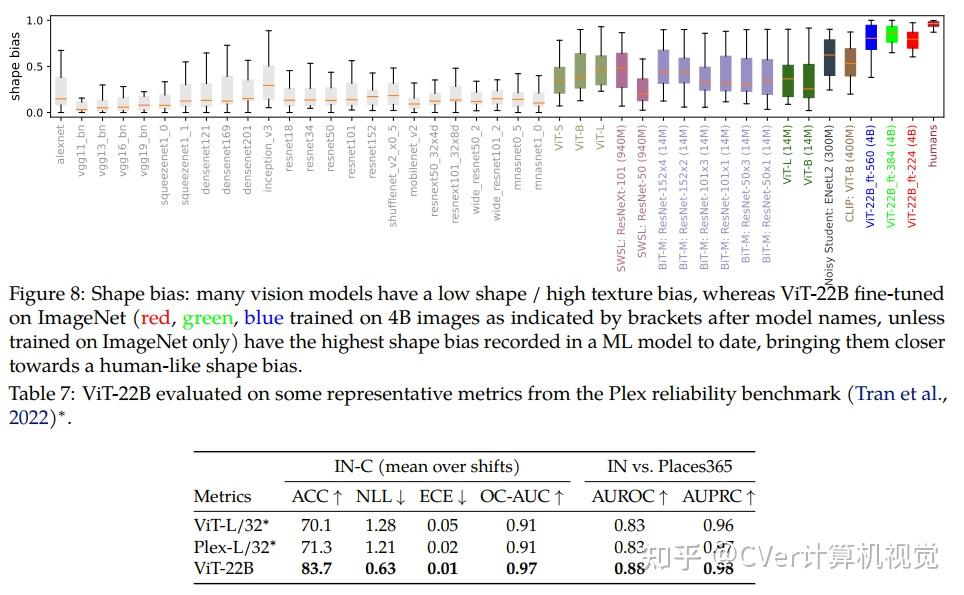 当对下游任务进行评估时(通常使用冻结特征的轻量级线性模型),ViT-22B显示出随着规模的增加性能的提高。我们进一步观察到规模的其他有趣的好处,包括公平性和性能之间的改进权衡,在形状/纹理偏差方面与人类视觉感知的最新对齐,以及改进的鲁棒性。ViT-22B展示了“类似LLM”的视觉扩展潜力,并提供了实现这一目标的关键步骤。