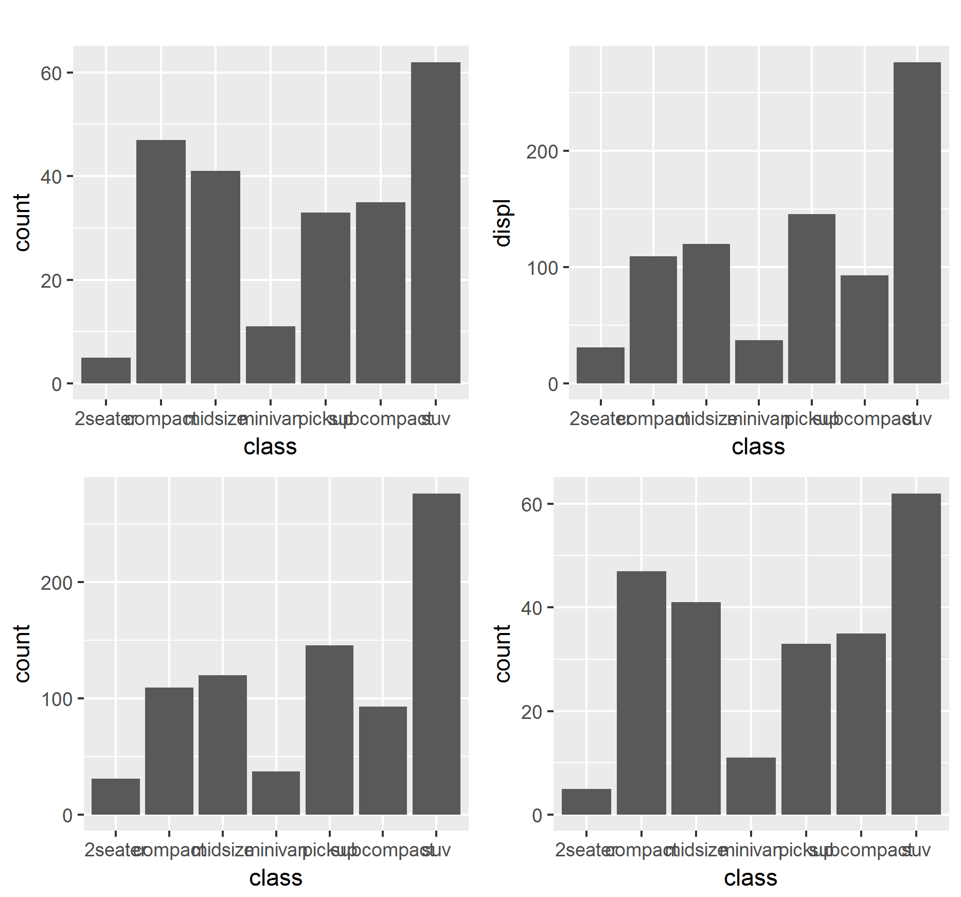 ggplot(mpg,aes(x=class,y=displ)) + geom_bar(stat="identity") # 使用第二种数据类型,接受两个参数