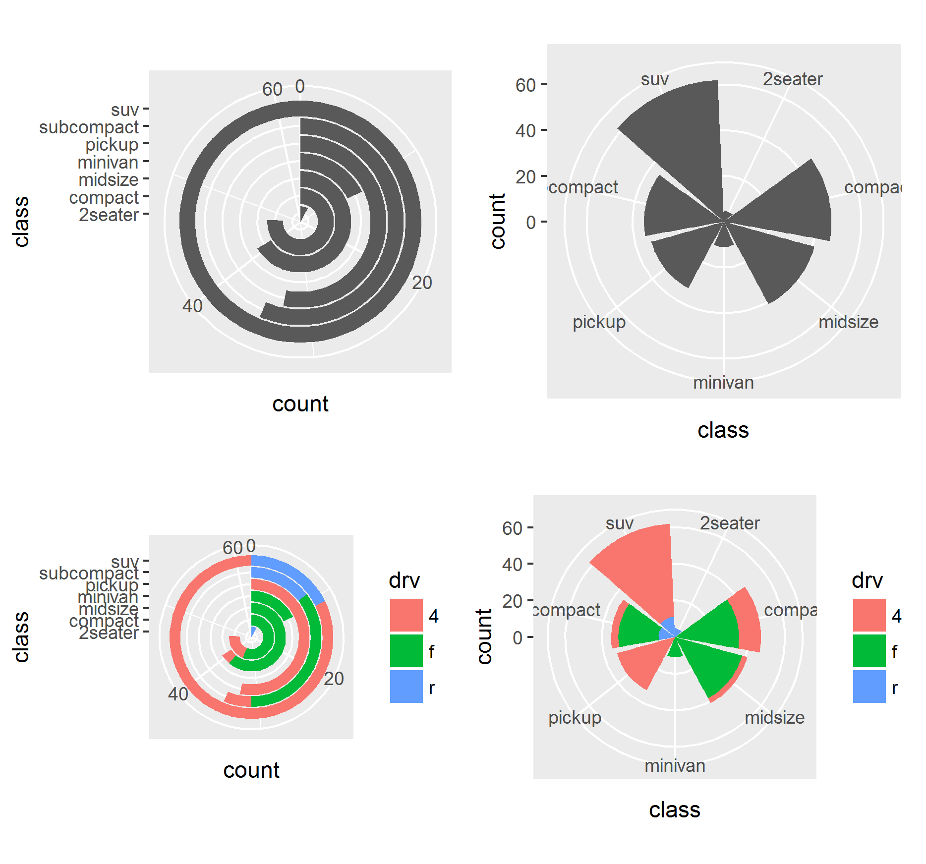 ggplot(mpg, aes(class))+geom_bar(aes(fill=drv))+coord_polar(theta = "x")