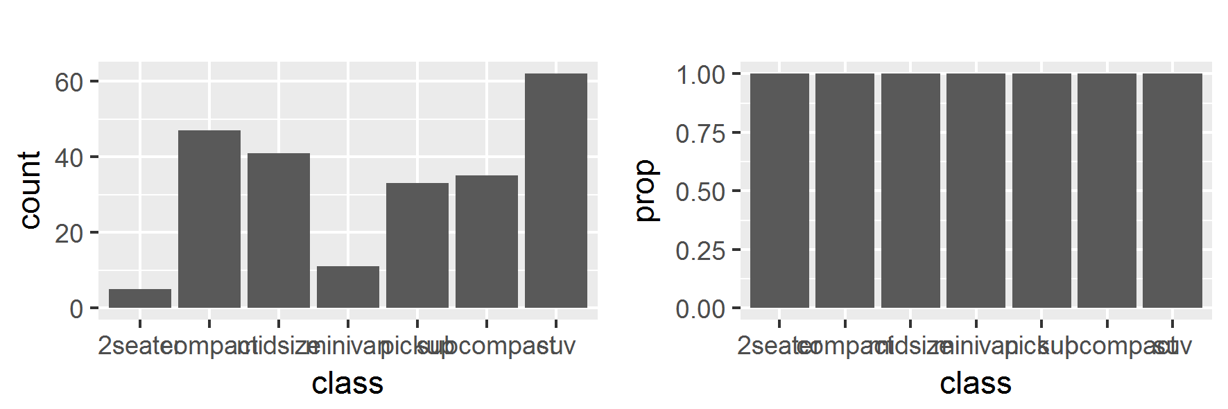 ggplot(mpg,aes(x=class,y=..prop..)) + geom_bar() # 每根柱子的prop都是1