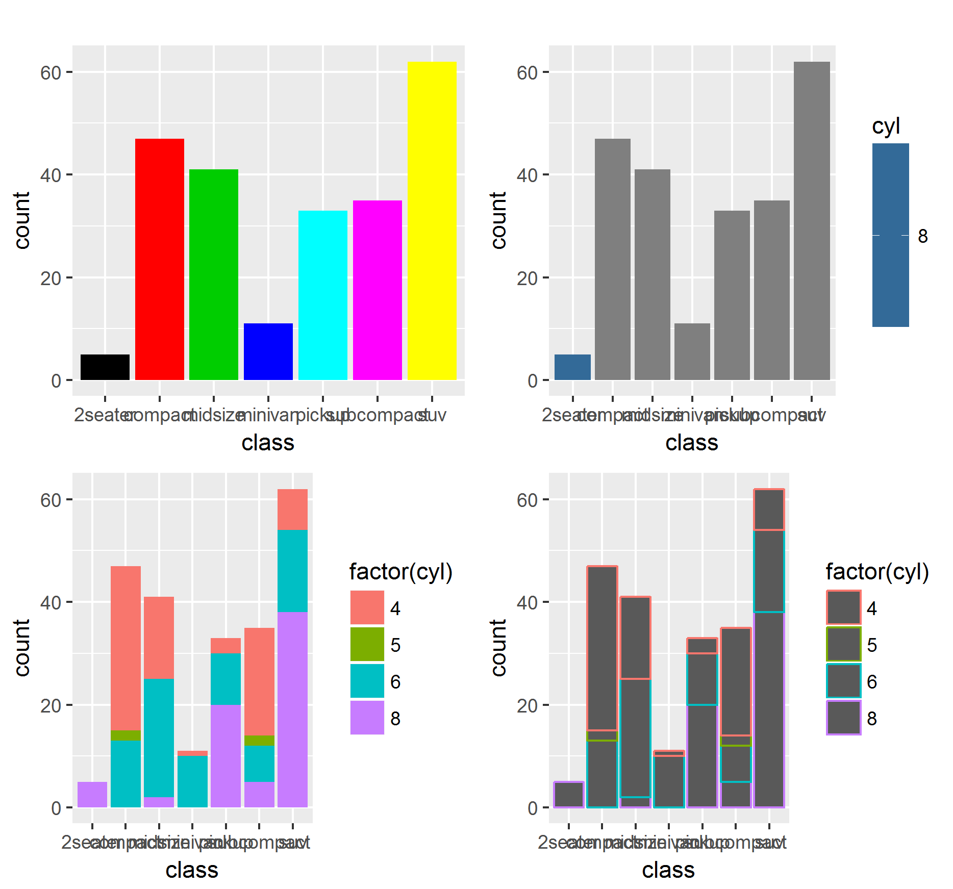 ggplot(mpg,aes(x=class)) + geom_bar(aes(color=factor(cyl))) # 图四