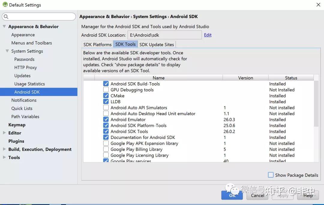 ,点击主界面上的Configure->SDK Manager,会弹出SDK管理界面。在这里可以下载安装需要的软件包与构建工具。如图所示,Cmake与LLDB可以直接在这里勾选安装,非常方便。