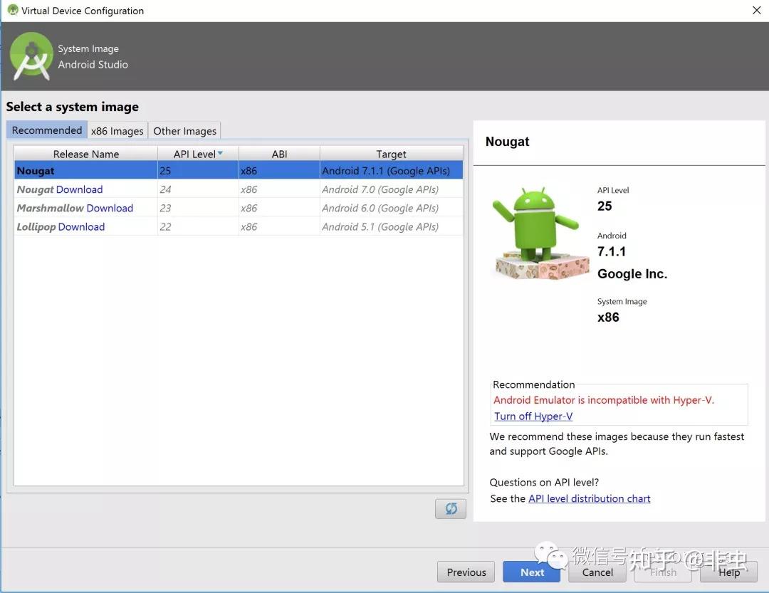 点击Create Virtual Device...按钮,弹出虚拟设备创建窗口,选择设备的类型,例如Nexus 6p,点击Next,选择创建的系统版本。支持的系统版本会在这里全部列出来,默认情况下会选择本机安装的最新系统版本镜像,对于本机没有安装的系统版本,会在系统版本名称的旁边显示一个Download按钮,点击该按钮,可以下载相应的虚拟设备镜像。如图所示,选择Nougat后点击Next,确认设备类型与版本号无误后,点击Finish即可完成创建。