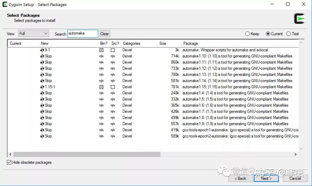 会列出所有与这个名字相关的软件包,在结果的Bin栏上打勾,选择要安装的