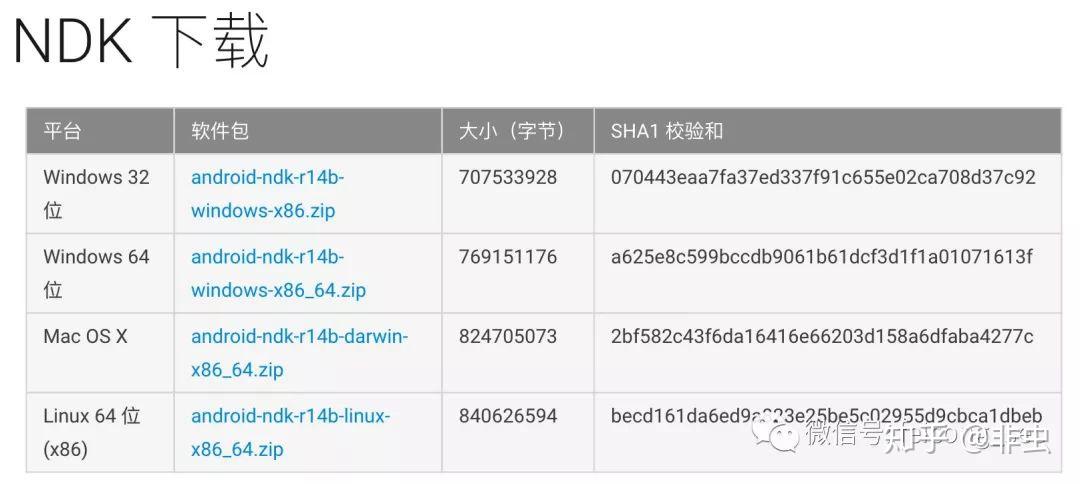 除了Android SDK方式安装Android NDK外,也可以从Android官网上下载最新的Android NDK压缩包进行安装,地址是: https:// developer.android.com/n dk/downloads/index.html 。如图所示,点击链接中的Windows版本,下载最新的Android NDK压缩包即可。