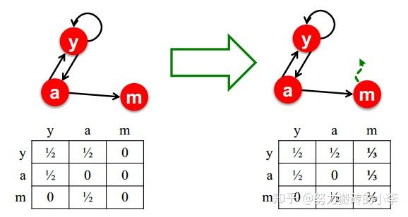 可以利用矩阵形式来表达上式,即 r=Mr ,M是随即邻接矩阵,如果 j\rightarrow i ,则 M_{ij}=\frac{1}{d_j} ,比如在上图中, M=\begin{pmatrix}\frac{1}{2} & \frac{1}{2} & 0 \\ \frac{1}{2} & 0 & 1 \\ 0 &\frac{1}{2} & 0 \end{pmatrix} ,即 \begin{pmatrix}r_y \\ r_a \\r_m \end{pmatrix}=\begin{pmatrix}\frac{1}{2} & \frac{1}{2} & 0 \\ \frac{1}{2} & 0 & 1 \\ 0 &\frac{1}{2} & 0 \end{pmatrix} = \begin{pmatrix}r_y \\ r_a \\r_m \end{pmatrix}