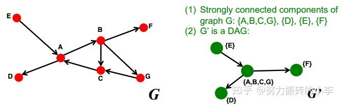 - 强连通分量(Strongly Connected Component):图中一个子图包含一系列节点S,S中每个节点都可以互达,并且没有更大的集合可以可以满足这个性质了,如下图所示,有4个强连通分量:{A,B,C,G}, {D}, {E}, {F}