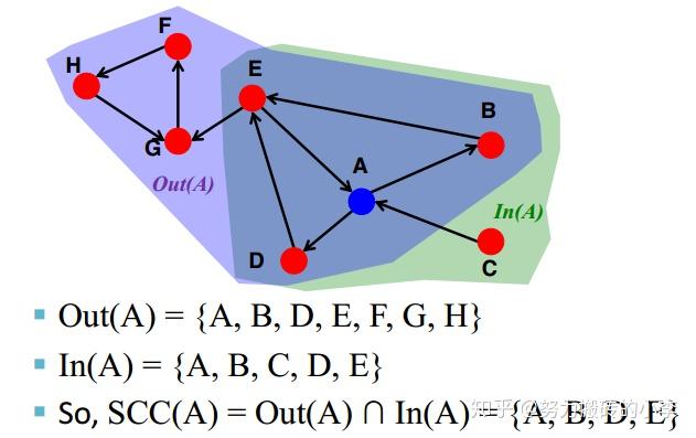 SCC=Out(A) \cap In(A) ,即通过节点能到达的集合,和能到达节点的集合取交集,即为包含该节点的强连通分量,如下图所示,包含节点A的强连通分量为{A,B,D,E}