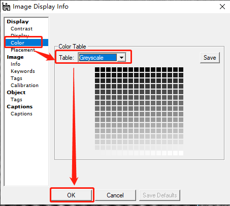 在Color中选择Color Table更换颜色映射表,点OK即可应用。这里我们也就看到了dm3格式的电镜图其实是“彩色”的,之所以我们认为是黑白的是因为他的颜色映射表默认是灰度“Greyscale”。