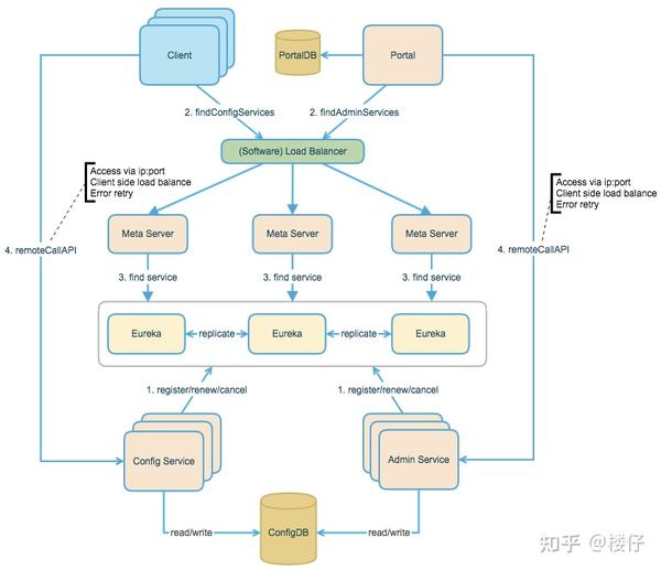 - Portal :配置管理界面,通过MetaServer获取AdminService的服务列表,使用客户端软负载SLB方式调用AdminService。