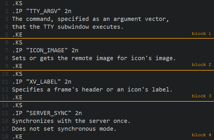 假设我们需要对以下文本进行排序。其中,每个条目是被“.KS”和“.KE”包围的文本块;而其定义的每个术语则是以“.IP”开头的多行文字。