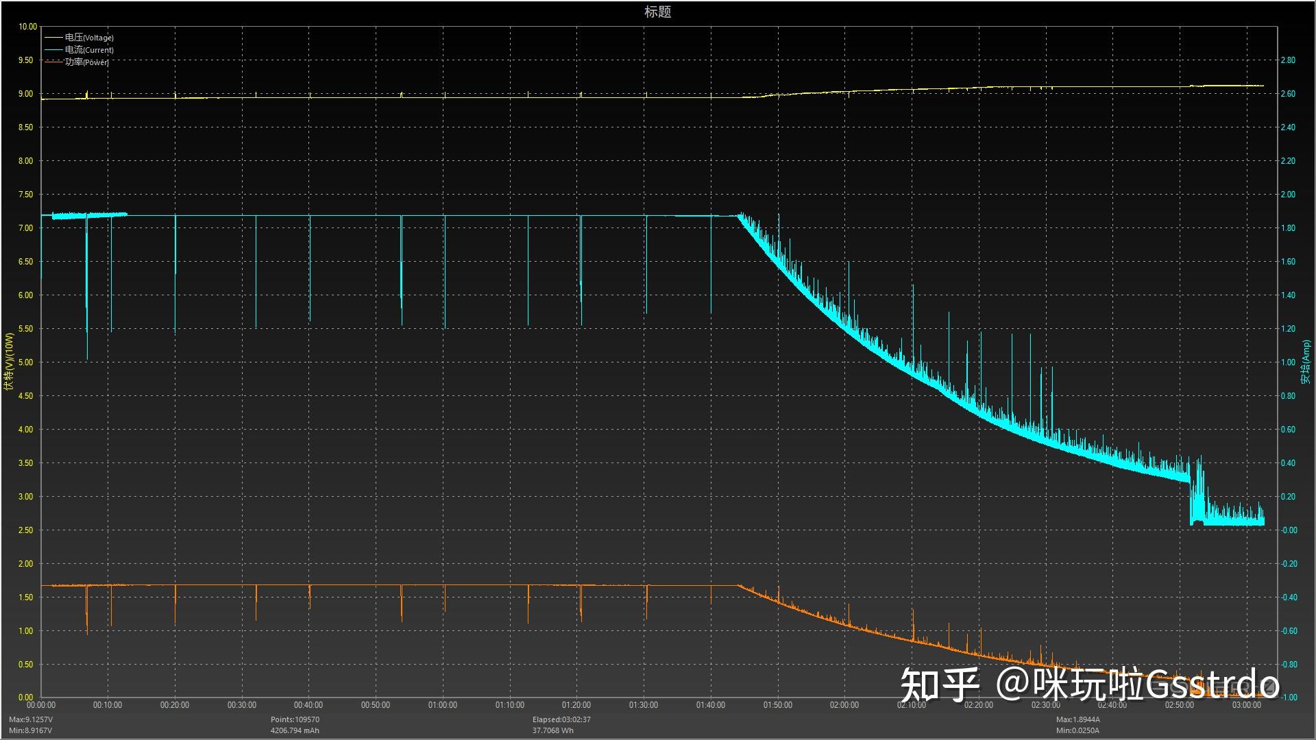 从功率图中可以看到Redmi Pad以接近17W功率稳定运行了1小时43分钟,这里面的下降是因为我需要打开查看充到多少了,每次打开功率会下降到12-14W之道屏幕再次关闭