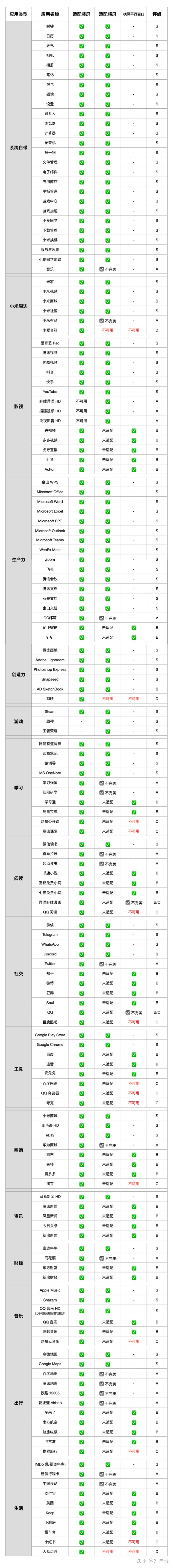 该测试涵盖了 150+ 自带和第三方应用,而在 Redmi Pad 上我重新进行了检查和复核,发现对比那次测试结果竟然还略有进步(比如飞书完美适配了横屏)那么以下内容我就在之前基础上做更新好了(已经用新的结果更新到那篇里了)