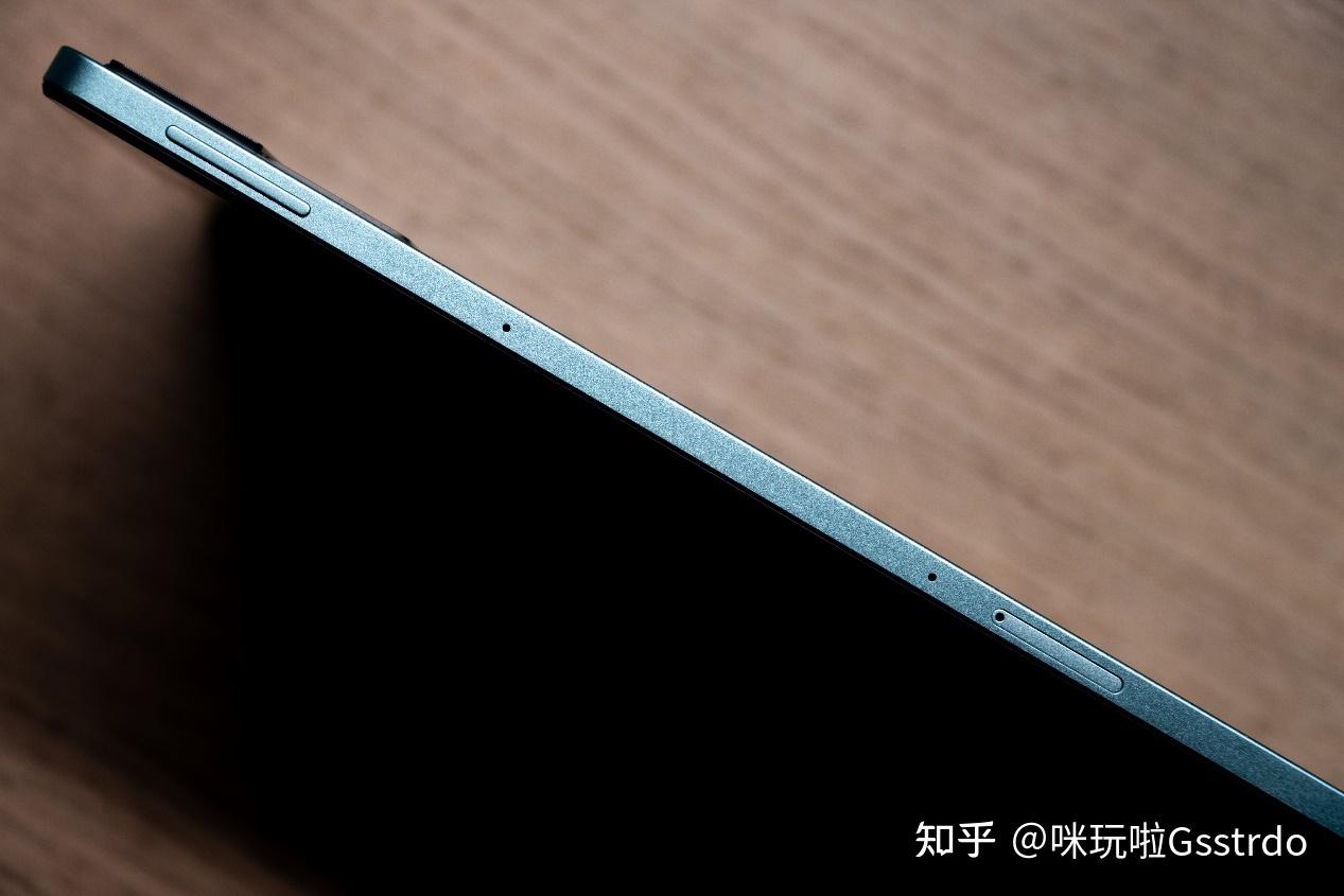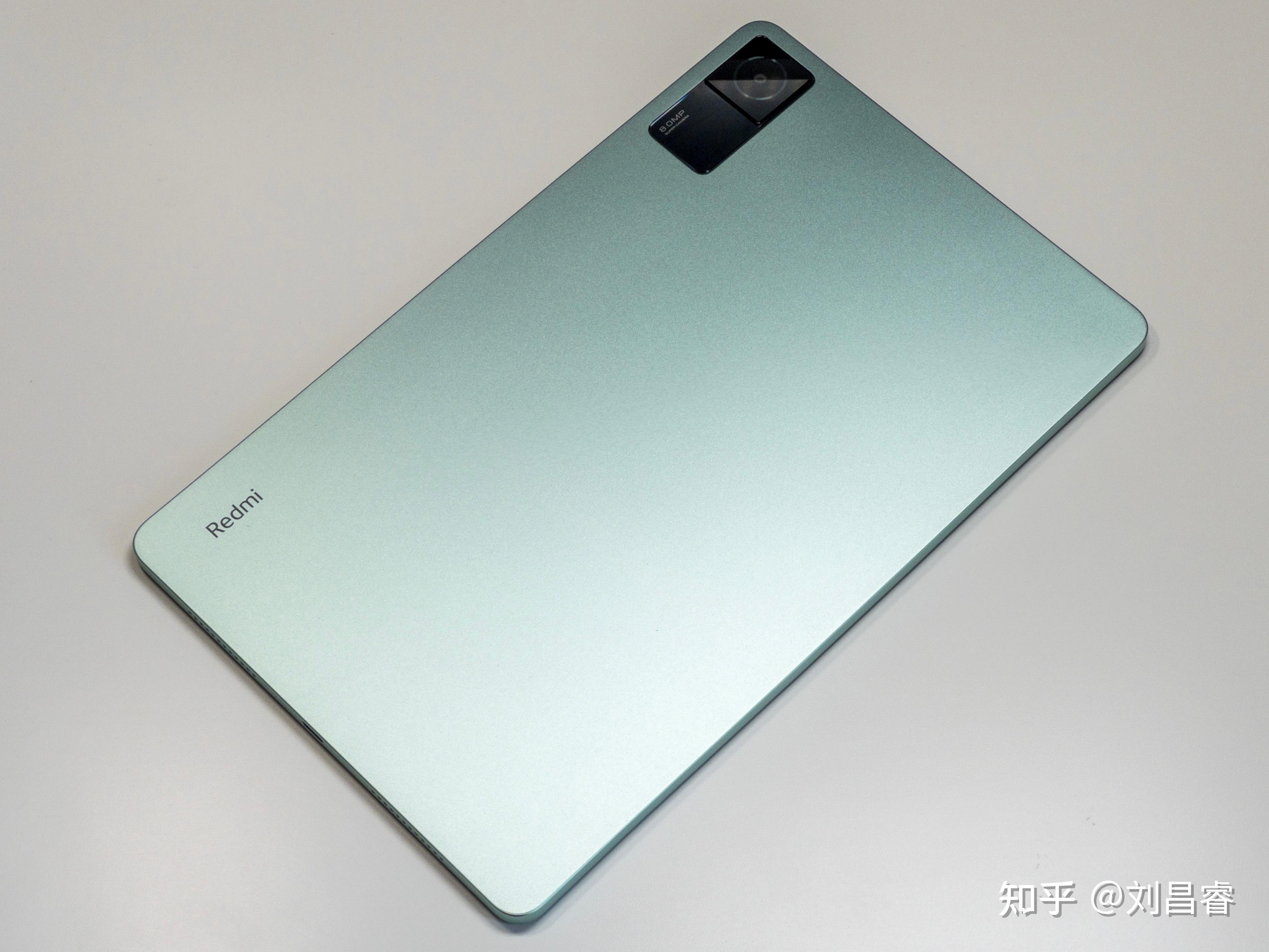 Redmi Pad最让我惊喜的是在这个价位采用了Unibody全金属机身,我拿到的颜色是烟青绿,金属材质拿着非常顺滑冰冰凉不沾指纹,背后的元素比较少显得非常简约,在光线的折射下金属的质感非常棒