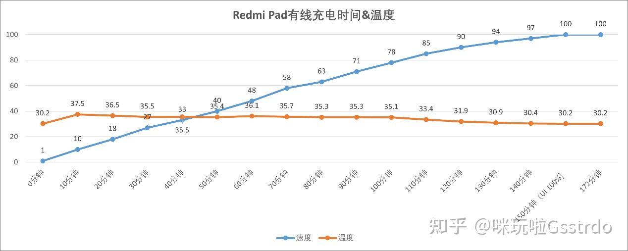 Redmi Pad配置了这个价位段相同的18W有线充电功率,并附赠了22.5W的充电器,我们对充电测试进行控制变量