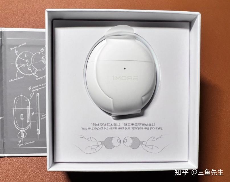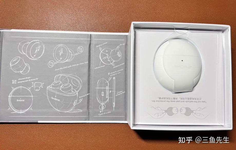 然后,这次采用的是翻盖式的开箱方式。开箱之后,左边是耳机的设计图纸,右边看到的是耳机充电仓。