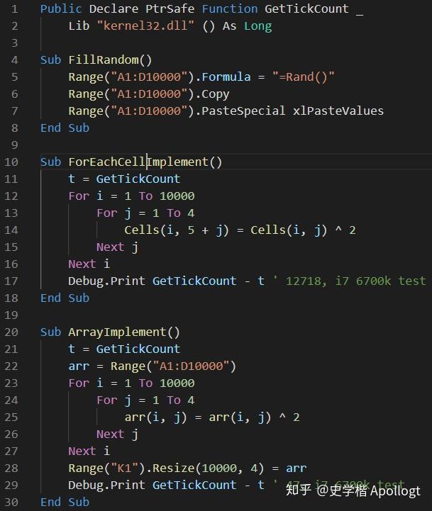 FillRandom 在 A1:D10000 这四万个单元格中生成随机数;拷贝随机数为常数,避免触发自动计算带来的开销;