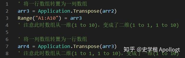 (1 to 1, 1 to 10) 形式的数组,也可以通过 Transpose 转置为一列数组,因此可以利用这个机制将一个 (1 to 1, 1 to 10) 转变为一个 (1 to 10) 的数组;