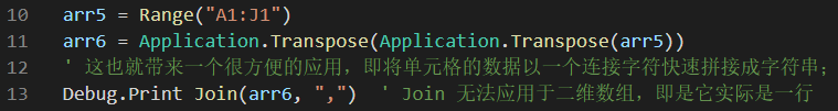 前面提到从 Range("") 导入的数组,即是是一行,也是二维数组,即 Range("A1:J1") 是 (1 to 1, 1 to 10) 的二维数组;