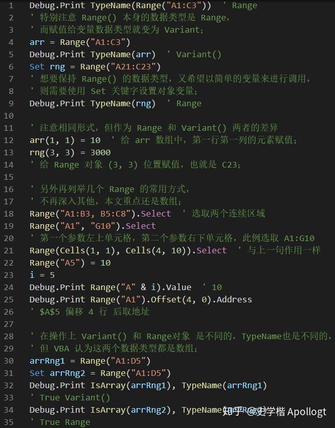 最让人懵逼的地方是 Set 一个 Range() 它的 TypeName 是 Range,IsArray 是 True,但不能把它赋值给一个数组,如果把它赋值给一个 未声明的 或 Variant 变量,它又被自动转换成了 Variant(),看下面这个例子,注意 TypeName: