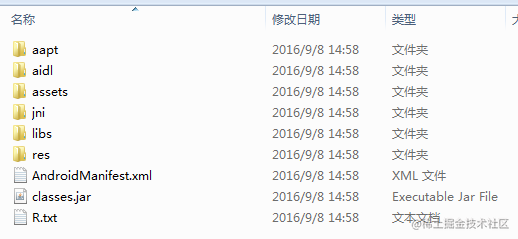xxx.aar,AAR(Android Archive)是一个Android库项目的二进制归档文件,里面不仅包含工程代码也还包含工程资源文件,例如各种字体大小,字符串资源,图片等,当然每个工程所包含的资源文件不用,最后编译出来的aar文件里面包含的内容也不尽相同,例如有的工程有aidl业务处理,但是大部分都包括:AndroidManifest.xml,classes.jar,res,R.txt,你可以随便找一个aar文件将后缀名字改成.zip或者.rar压缩包形式,然后解压查看解压后的内容,